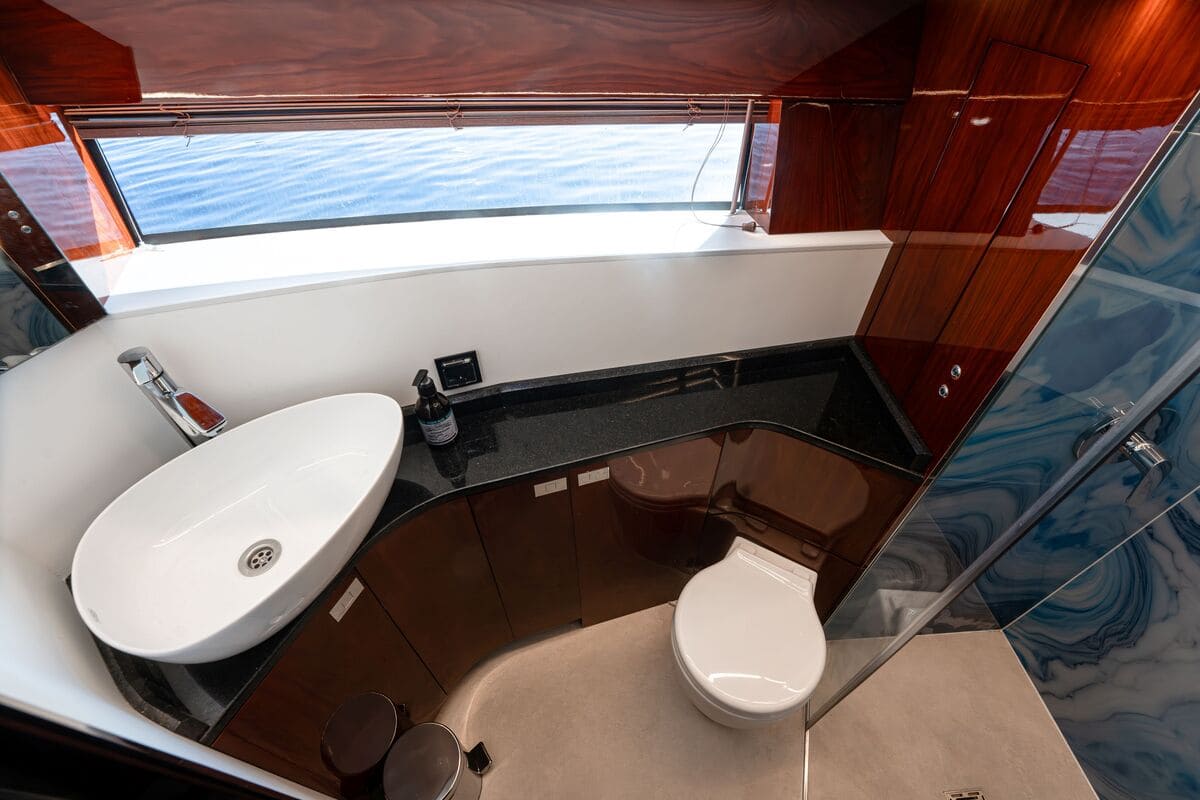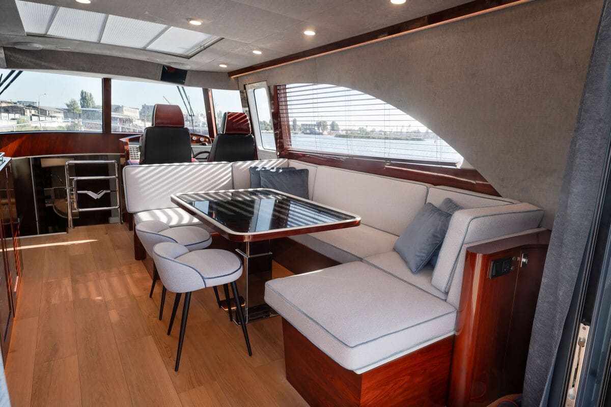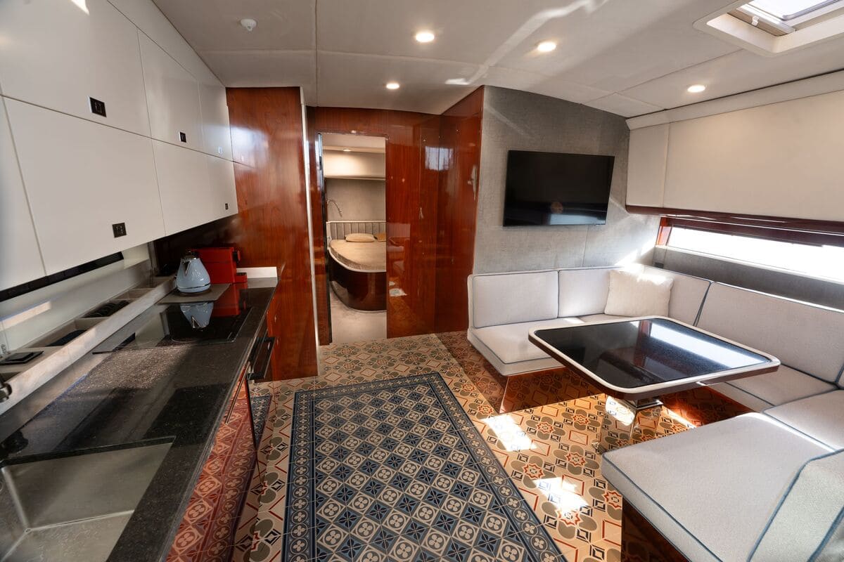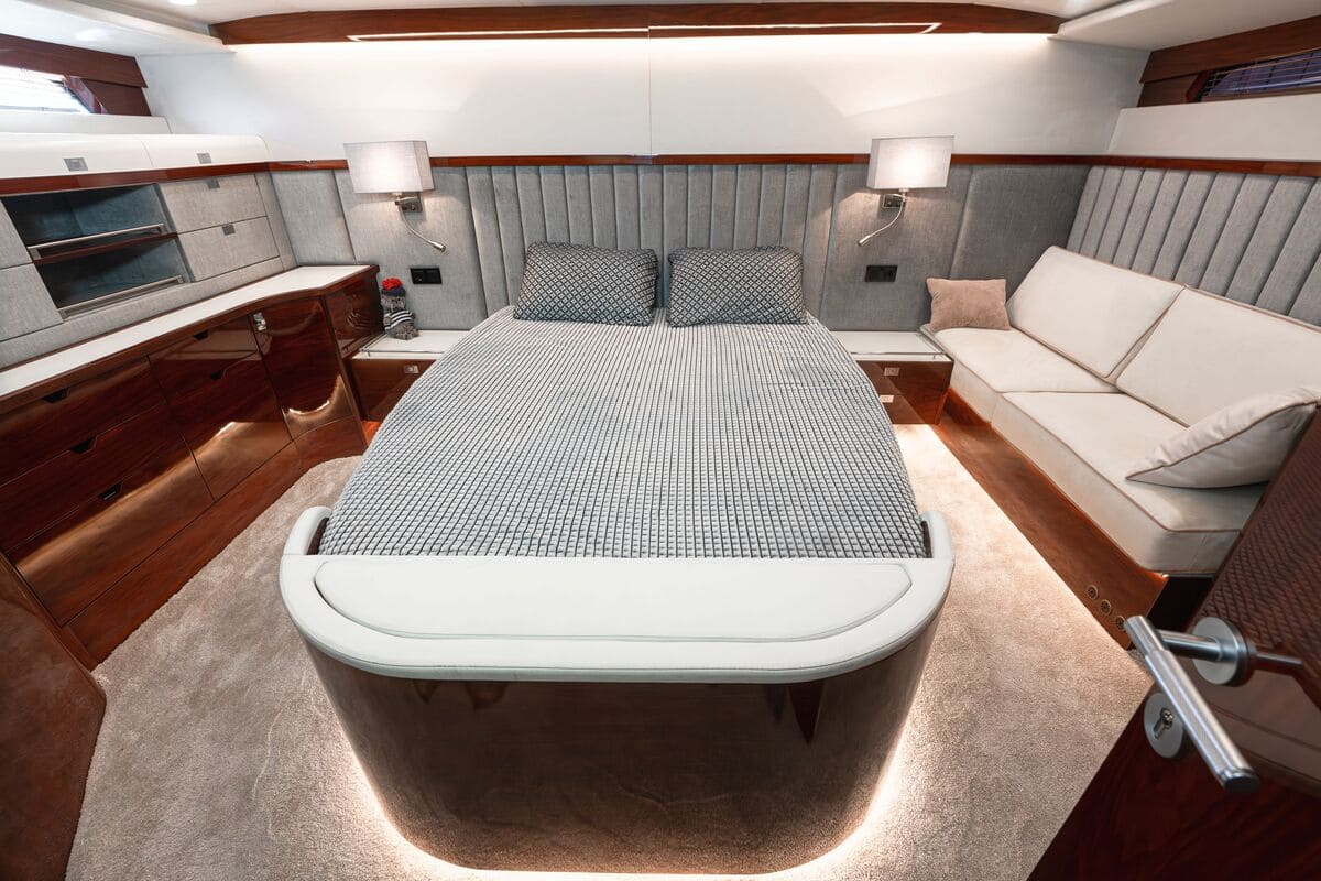 На борту предусмотрены: просторный салон с обеденной зоной, отдельная зона камбуза, мастер-каюта владельца, гостевая каюта, два санузла с душевыми кабинами, большой кокпит, гараж для дельных вещей, увеличенная купальная платформа. Дополнительно, в кормовой части находится отдельная каюта для капитана, включающая собственный санузел и спальное место — решение, рассчитанное на эксплуатацию с постоянным экипажем. По желанию Заказчика были установлены стабилизаторы качки DMS Magnus Master и система дистанционной швартовки DOCKMATE.